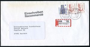 5393 | 14 € | POSTLEITRAUM 7700 (OHNE SINGEN) : 78187 GEISINGEN 1/ zz 1995 (7.7.) 1K-Segment auf Paar 200 Pf. Bertha v. Suttner (Nobelpreis) u.a. + Selbstklebe-RZ: 78187 Geisingen 1/ z z (nur kurze Verwendungszeit!) Fern-R-Bf. | ![]() | |