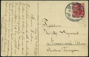5399 | 18 € | POSTLEITRAUM 7700 (OHNE SINGEN) : HEUBERG/ TRUPPEN=/ ÜBUNGSPLATZ(BZ.KONSTANZ) 1916 (22.3.) 1K-Brücke + viol. Zensur-Ra.2: Mülhausen (Els) 1/P. K./ geprüft und/zu befördern (Rie.16) + hs. Abs., klar gest. Feldpost-Color-Zensur-Ak.: Ruine Hausen | ![]() ![]() | |