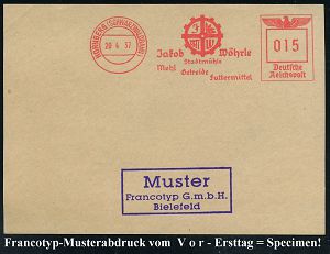 5406 | 35 € | POSTLEITRAUM 7700 (OHNE SINGEN) : HORNBERG (SCHWARZWALDBAHN)/ J W/ Jakob Wöhrle/ Stadtmühle/ Mehl/ getreide/ Futtermittel 1937 (20.4.) AFS-Musterabdruck Francotyp "Reichsadler" (Zahnrad-Firmenlogo) glasklar gest. Francotyp-Musterblatt vom V o r - Ersttag ! (mit Attest), selten! (Dü.E-5CGo) | ![]() ![]() | |