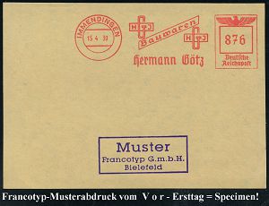 5419 | 35 € | POSTLEITRAUM 7700 (OHNE SINGEN) : IMMENDINGEN/ HJG/ Bauwaren/ Hermann Götz 1939 (15.4.) AFS-Musterabdruck (Monogr.-Logo) glasklar gest. Francotyp-Musterblatt vom V o r - Ersttag ! (mit Attest), selten! (Dü.E-5CGo) | ![]() ![]() | |