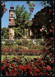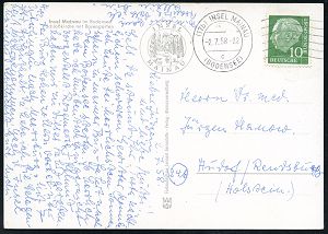 5420 | 10 € | POSTLEITRAUM 7700 (OHNE SINGEN) : (17b) INSEL MAINAU/ c/ (BODENSEE) 1958 (2.7.) MaWellenSt (6 Wellen rechts) auf EF 10 Pf. Heuss I auf Color-Foto-Ak.: Schloßkirche u. Rosengarten (Verlag Mainauverwaltung), Bedarf | ![]() ![]() | |