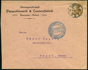 5429 | 18 € | POSTLEITRAUM 7700 (OHNE SINGEN) : KONSTANZ/ *1* 1917 (9.5.) 1K-Brücke auf EF 15 Pf. Germania mit Firmenlochung "P C K" = P apyrolinwerk & Couvertfabrik Konstanz auf Firmen-Bf. + b l a u e r Zensur-2K: ÜBERWACHUNGSSTELLE KONSTANZ/ GEPRÜFT/XIV.A.K., Inl.-Zensur-Bf. n. Engen (Mi.100 EF, Perfin) | ![]() | |