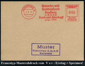 5453 | 35 € | POSTLEITRAUM 7700 (OHNE SINGEN) : KONSTANZ 1/ Gewerbe-u./ Handelsbank/ Konstanz.. 1937 (7.9.) AFS-Musterabdruck Francotyp "Reichsadler" , glasklar gest. Francotyp-Musterblatt vom V o r - Ersttag ! (mit Attest), selten! (Dü.E-5CGo) | ![]() ![]() | |