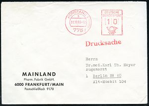 5469 | 6 € | POSTLEITRAUM 7700 (OHNE SINGEN) : 775 KONSTANZ 1/ b/ DEUTSCHE/ BUNDESPOST 1966 (31.10.) PFS "Posthorn" 10 Pf. mit Uhrzeit auf Firmen-Bf.: MAINLAND, Pharm. Fabrik.. (Dü.D-17 mit neuer PLZ) | ![]() | |