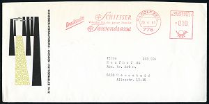 5494 | 12 € | POSTLEITRAUM 7700 (OHNE SINGEN) : 775 RADOLFZELL/ Schiesser7Wäsche für die ganze Familie/ Tausendsassa 1965 (26.4.) AFS Francotyp (Firmen-Logo: Armbrust) Firmen-Bf.: SCHIESSER-VERKAUFSBÜRO , 43 ESSEN.. mit rauchenden Schloten (Dü.E-26 mit Zusatz "Drucksache") | ![]() | |