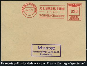5504 | 35 € | POSTLEITRAUM 7700 (OHNE SINGEN) : SCHONACH (SCHWARZW)/ JOS.BURGER SÖHNE/ GMBH.. 1937 (14.7.) AFS-Musterabdruck Francotyp "Reichsadler" , glasklar gest. Francotyp-Musterblatt vom V o r - Ersttag ! (mit Attest), selten! (Dü.E-5CGo) | ![]() ![]() | |