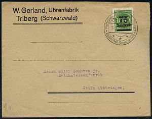 5519 | 18 € | POSTLEITRAUM 7700 (OHNE SINGEN) : TRIBERG/ ***/ Weltbekannter Höhenluftkurort.. 1923 (11.9.) HWSt auf EF 75 T./1000 Mk. , Firmen-Bf.: W. Gerland, Uhrenfabrik.. n. Weida/Thür. (Bo.1) | ![]() | |