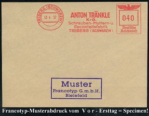 5520 | 35 € | POSTLEITRAUM 7700 (OHNE SINGEN) : TRIBERG (SCHWARZW)/ ANTON TRÄNKLE/ K.G./ Schrauben-,Muttern-u./ Faconteilefabrik.. 1937 (13.4.) AFS-Archiv-Muster Francotyp "Reichsadler" , glasklar gest. Francotyp-Musterblatt vom V o r - Ersttag ! (mit Attest), selten! (Dü.E-5CGo) | ![]() ![]() | |
