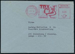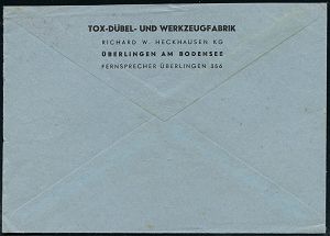 5529 | 12 € | POSTLEITRAUM 7700 (OHNE SINGEN) : (17b) ÜBERLINGEN (BODENSEE)/ TOX/ DÜBEL hält! 1957 (7.1.) AFS Postaliia (Mann befestigt Dübel) rs. Abs.-Vordruck: TOX-DÜBEL UND WERKZEUGFABRIK.., Fern-Bf. (Dü.23 B) | ![]() ![]() | |