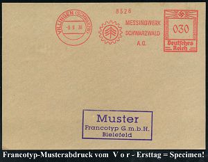 5538 | 35 € | POSTLEITRAUM 7700 (OHNE SINGEN) : VILLINGEN (SCHWARZW)/ MESSINGWERK/ SCHWARZWALD/ AG 1936 (8.9.) AFS-Musterabdruck Francotyp "Hakenkreuz" (Firmen-Logo) glasklar gest. Francotyp-Musterblatt vom V o r - Ersttag ! (mit Attest), selten! (Dü.E-5CEh) | ![]() ![]() | |