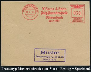 5550 | 35 € | POSTLEITRAUM 7700 (OHNE SINGEN) : VÖHRENBACH/ X.Heine & Sohn/ Präzisionsdrehteile.. 1938 (22.7.) AFS-Musterabdruck Francotyp "Reichsadler" , glasklar gest. Francotyp-Musterblatt vom V o r - Ersttag ! (mit Attest), selten! (Dü.E-5CGo) | ![]() ![]() | |