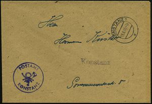 5442 | 14 € | POSTLEITRAUM 7700 (OHNE SINGEN) : KONSTANZ 1/ d 1951 (25.6.) 2K-Steg + viol. 1K-HdN: POSTAMT/D/ KONSTANZ (Posthorn) klar auf Orts-Postdienst-Bf. | ![]() | |