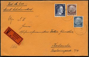 5525 | 22 € | POSTLEITRAUM 7700 (OHNE SINGEN) : ÜBERLINGEN (BODENSEE)/ a 1941 (15.9.) 2K-Steg auf 94 Pf.-Frankatur Hindenbg. - Hitler (teils undeutl.,da rs.Siegel) + roter VZ: Überlingen/(Bodensee), gesiegelter Fern-Wert-Bf. 600.- RM (Mi.514, 518, 798) | ![]() ![]() | |