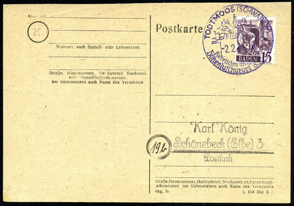 5805 | 20 € | POSTLEITRAUM 7800 (OHNE FREIBURG) : TODTMOOS (SCHWARZW)/ Herrliches Skigelände/ Höhenluftkurort.. 1948 (2.2.) seltener v i o l e t t e r HWSt (Ort) klar auf Inl.-Karte in die SBZ (Bo.2, violett) | ![]() | |