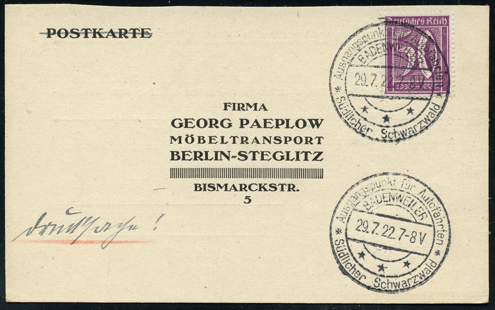5652 | 18 € | POSTLEITRAUM 7800 (OHNE FREIBURG) : BADENWEILER/ ***/ Ausgangspunkt für Autofahrten/ Südlicher Schwarzwald 1922 (29.7.) HWSt klar auf Inl.-Drs.-Karte (Bo.1, nur 1922-23 verwendet) | ![]() | |