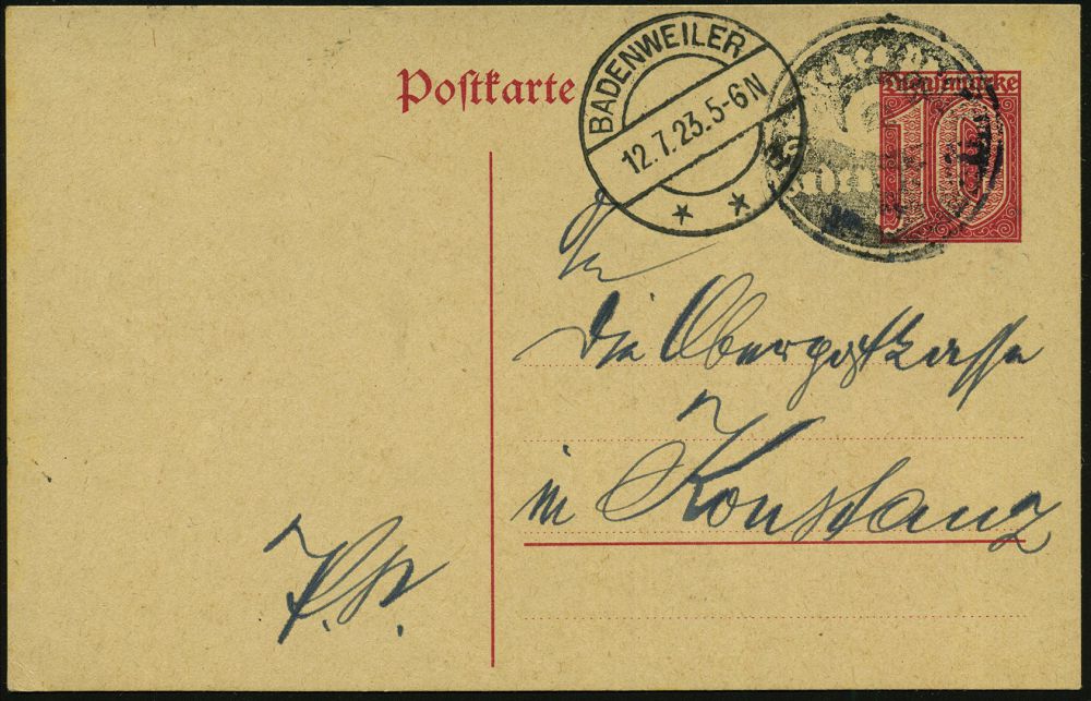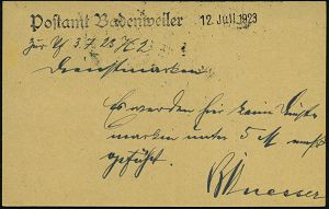 5653 | 20 € | POSTLEITRAUM 7800 (OHNE FREIBURG) : BADENWEILER/ *** 1923 (12.7.) 1K-Brücke + Negativ-HdN: Deutsches Postamt/Badenweiler (Posthorn) auf Dienst-P 10 Pf. als Formblatt + rs. 1L: Postamt Badenweiler, Inl.-Dienst-Kt. n. Konstanz (Mi.DP 1) | ![]() ![]() | |