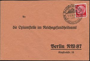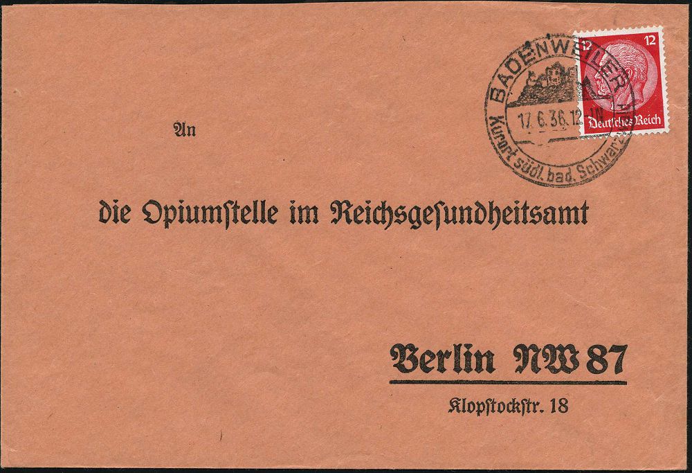 5654 | 40 € | POSTLEITRAUM 7800 (OHNE FREIBURG) : BADENWEILER/ Kurort..Schwarzwald 1936 (17.6.) HWSt (Burg) auf rosa Antwort-Dienst-Bf:: Opiumstellle im Reichsgesundheitsamt, Berlin NW 76, sehr selten! (Bo.2) | ![]() ![]() | |