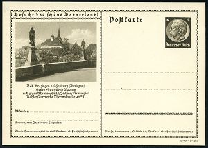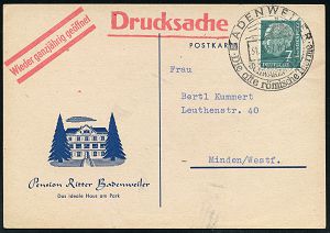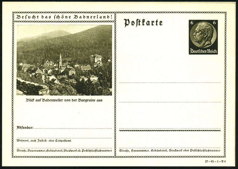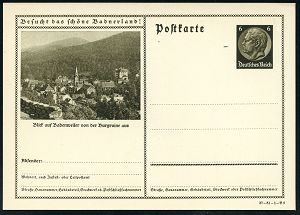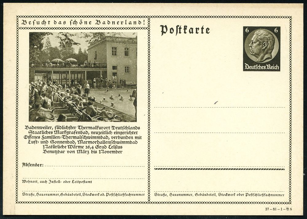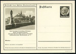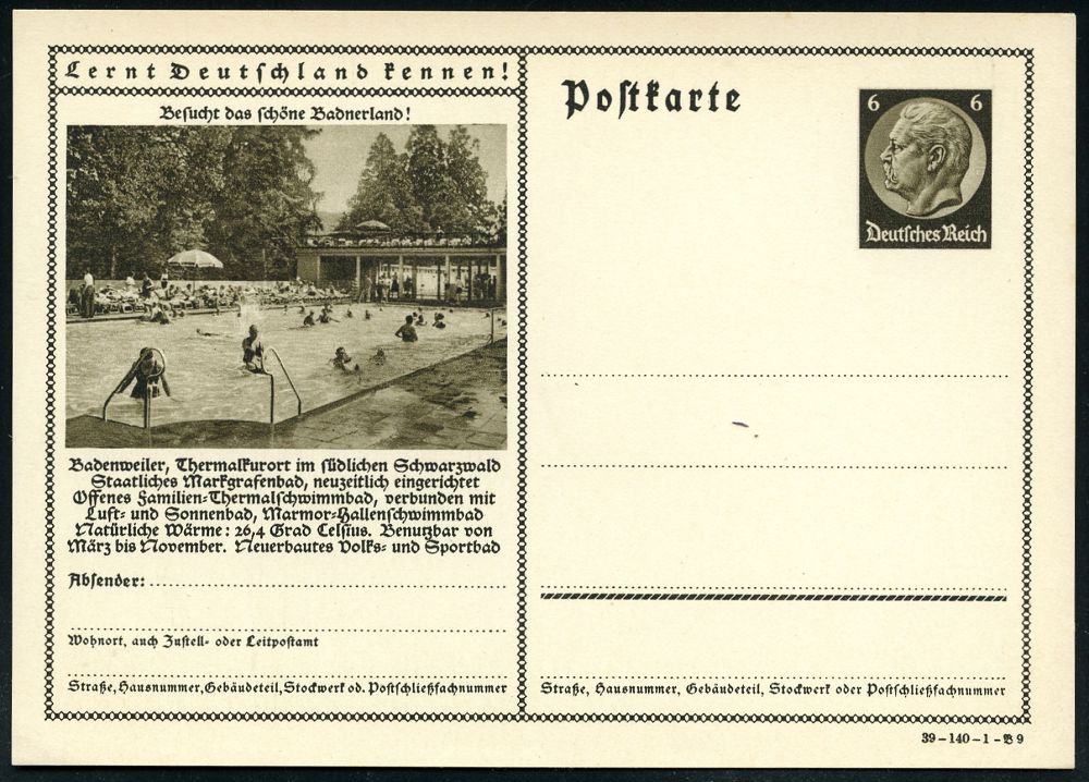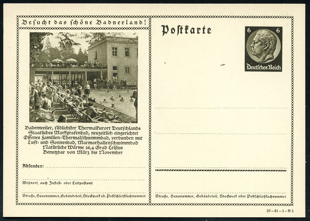 5657 | 10 € | POSTLEITRAUM 7800 (OHNE FREIBURG) : Badenweiler 1937 6 Pf. BiP Hindenbg., braun: Thermal-Schwimmbad.., Sonderform "Besucht das schöne Badnerland!" , ungebr. (Mi.P 236/37-140--B 9) | ![]() | |