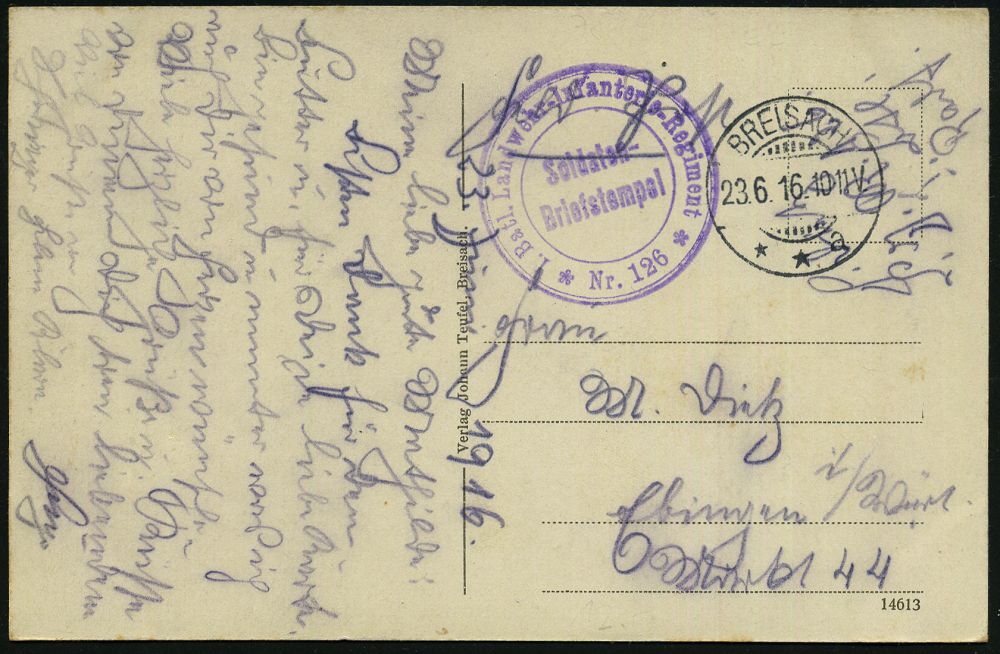 5668 | 14 € | POSTLEITRAUM 7800 (OHNE FREIBURG) : BREISACH/ **a 1916 (23.6.) 1K-Gitterbrücke auf Color-Ak.: Kaserne + viol. 3K-HdN: Batl. Landwehr-Infaterie-Regiment/Nr. 126 , klar gest. Feldpost-Kt. n. Ebingen | ![]() ![]() | |