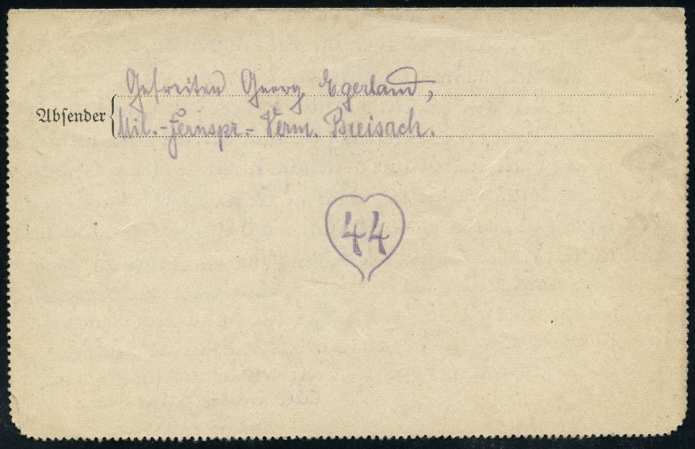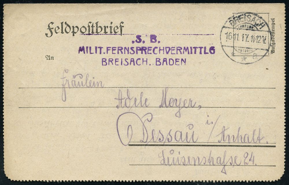 5669 | 14 € | POSTLEITRAUM 7800 (OHNE FREIBURG) : BREISACH/ **a 1917 (16.11.) 1K-Gitterbrücke + viol. 3L.: S.B./MILIT. FERNSPRECHVERMITTLG/ BREISACH.. , klar gest. Feldpost-Faltbf. mit Inhalt n. Passau | ![]() ![]() | |