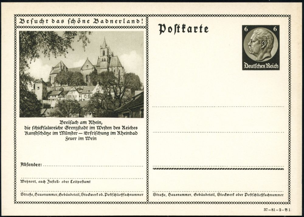 5670 | 10 € | POSTLEITRAUM 7800 (OHNE FREIBURG) : Breisach am Rhein 1937 6 Pf. BiP Hindenburg, braun, Sonderform: "Besucht das schöne Badnerland!" = Münster , ungebr. (Mi.P 236-37-81-B 1) | ![]() | |