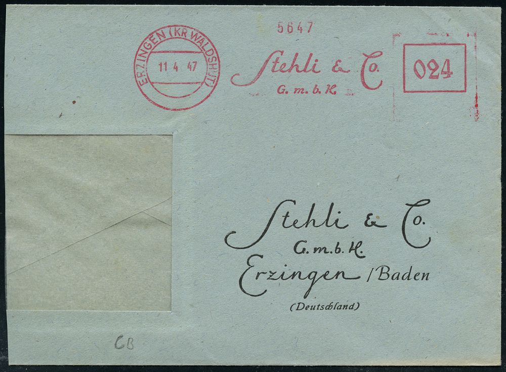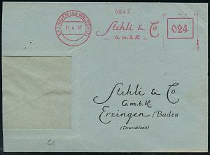5679 | 20 € | POSTLEITRAUM 7800 (OHNE FREIBURG) : ERZINGEN (WALDSHUT)/ Stehli & Co/ GmbH 1947 (11.4.) aptierter AFS Francotyp "Reichsadler" = entfernt, nur Mittelfragment erhalten! = Notmaßnahme! , klar gest. Teil-Firmen-Bf. (Dü.E-13 AU-127h = seltene Type) | ![]() | |