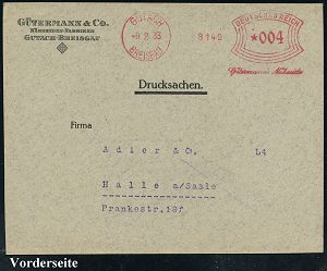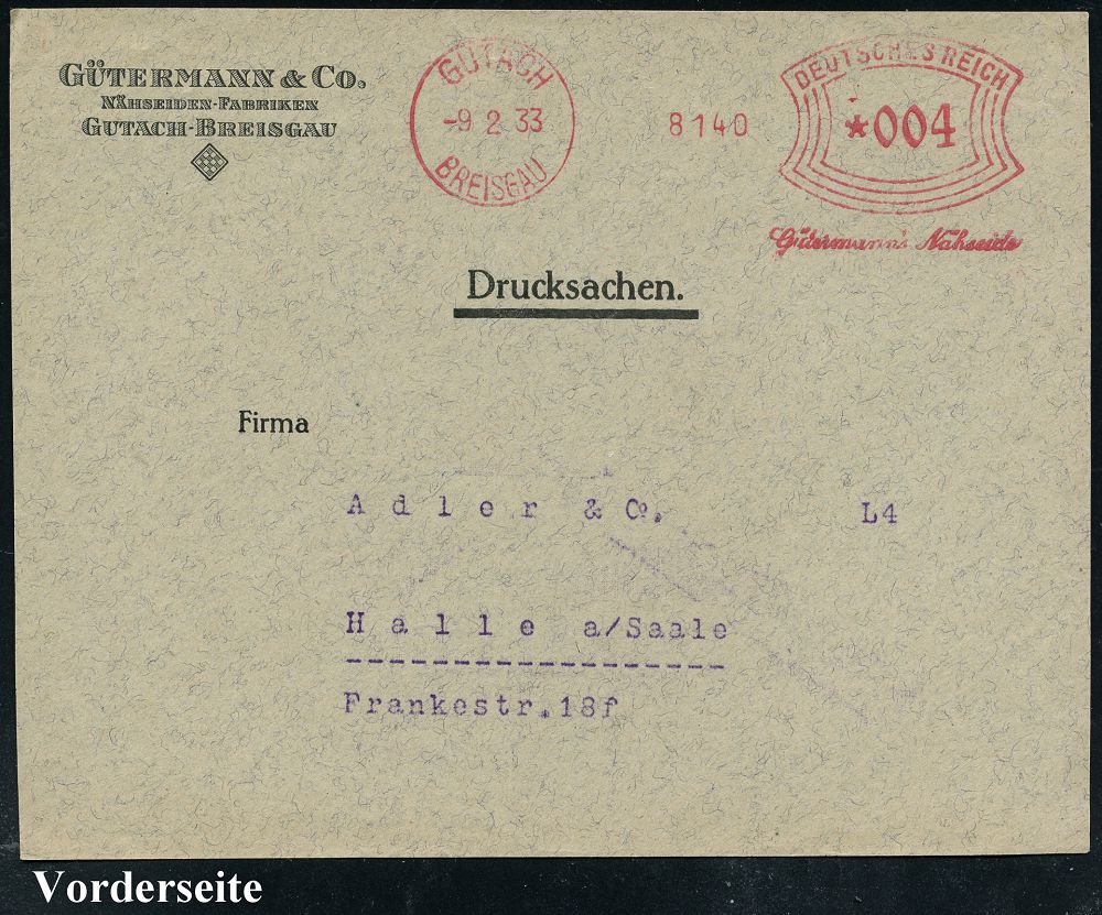5687 | 15 € | POSTLEITRAUM 7800 (OHNE FREIBURG) : GUTACH/ BREISGAU/ Gütermann´s/ Nähseide 1933 (9.2.) AFS Francotyp "Bogenrechteck" klar auf Firmen-Vorderseite mit Firmen-Logo: Seiden-Quadrat (Dü.E-1Am) | ![]() ![]() | |