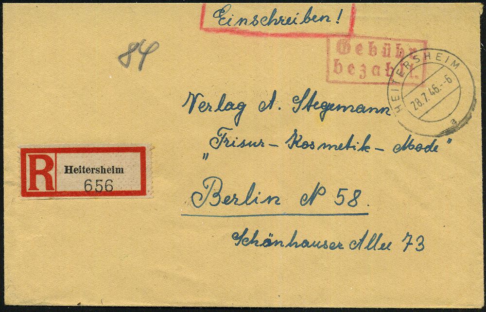 5699 | 14 € | POSTLEITRAUM 7800 (OHNE FREIBURG) : HEITERSHEIM/ a 1946 (28.7.) 2K-Steg + roter Ra.2: Gebühr/bezahlt + RZ: Heitersheim , klar gest. Fern-R-Bf. n. Ost-Berlin | ![]() | |