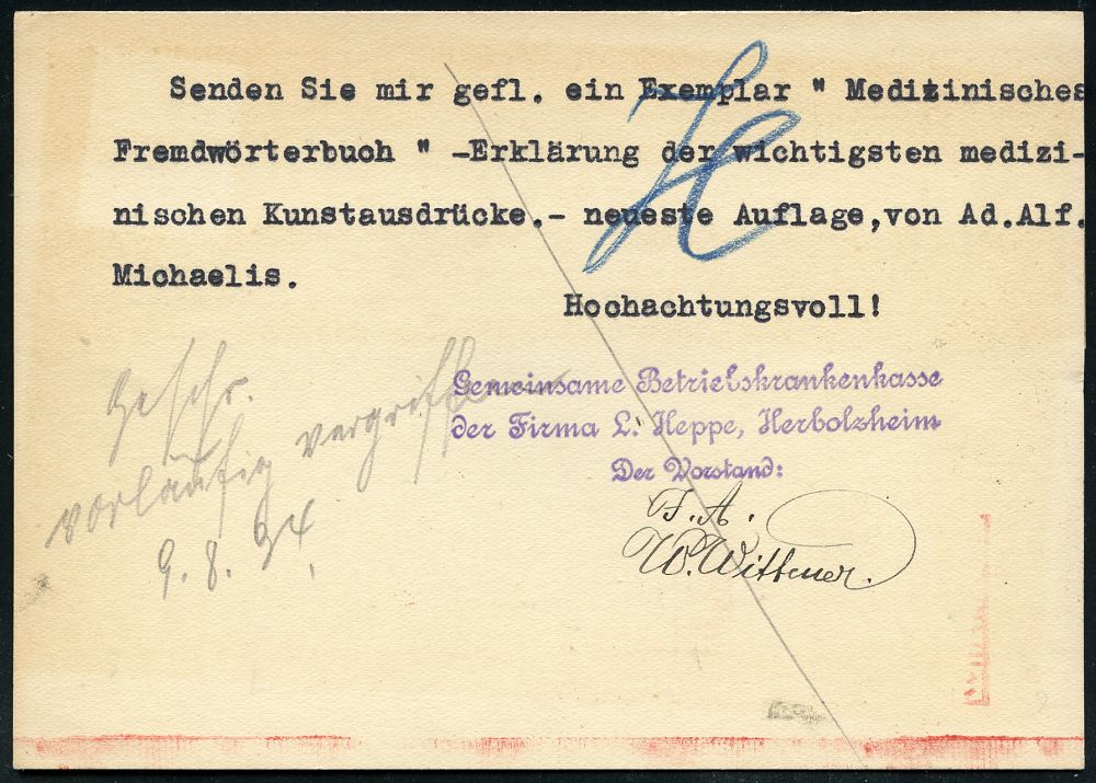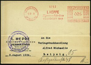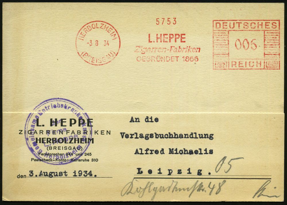 5701 | 20 € | POSTLEITRAUM 7800 (OHNE FREIBURG) : HERBOLZHEIM/ (BREISGAU)/ L.HEPPE/ Zigarren-Fabrinen/ GEGR.1866 1934 (3.8.) AFS Francotyp "Mäanderrechteck" + interess., viol. 2K-HdN: Gemeinsame Betriebskrankenkassen Herbolzheim.. , Firmen-Kt. n. Leipzig (Dü.E-2CEh) | ![]() ![]() | |