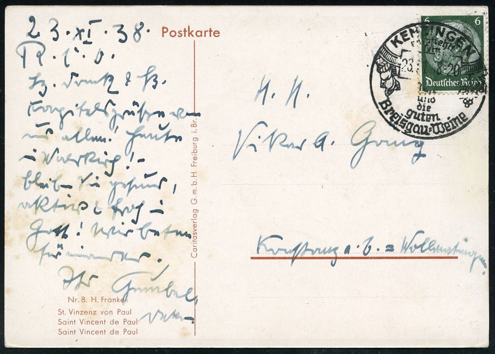 5716 | 15 € | POSTLEITRAUM 7800 (OHNE FREIBURG) : KENZINGEN/ ..Obst/ u./ die/ guten/ Breisgau-Weine 1938 (23.11.) HWSt (Pflaumen, Weintraube) klar Künstler-Color-Ak.: St. Vinzenz v. Paul mit Kindern (H. Franke) Bedarf (Bo.1) | ![]() ![]() | |