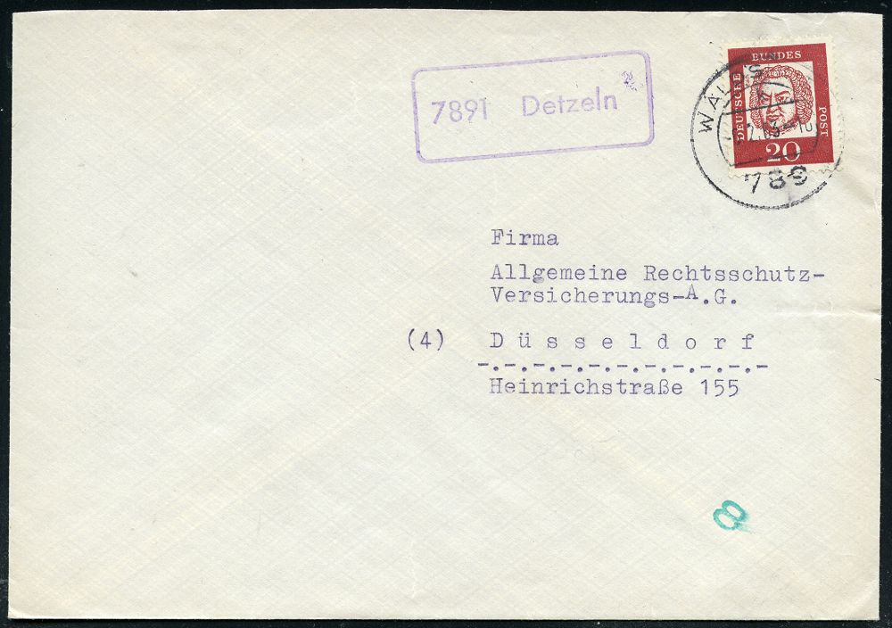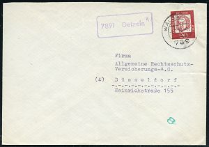 5672 | 12 € | POSTLEITRAUM 7800 (OHNE FREIBURG) : 7891 Detzeln 1963 (6.2.) viol. Ra. = PSt.II + 1K-Segment: 789 WALDSHUT 1/k , Fern-Bf. (Mi.352 EF) | ![]() | |