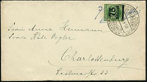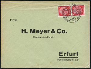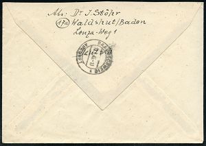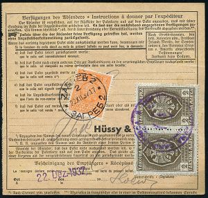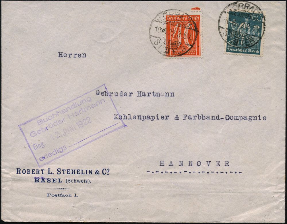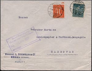 5722 | 25 € | POSTLEITRAUM 7800 (OHNE FREIBURG) : LÖRRACH/ STETTEN 1923 (10.6.) 1K-Gitter auf Infla 40 Pf. Ziffer u. 160 Pf. Landarbeiter , Firmen-Fern-Bf.: ROBERT L. STEHELIN.. BASEL n.Hannover = seltener R e m a i l i n g - Beleg zur Infla-Zeit ! (Mi.182, 190) | ![]() | |