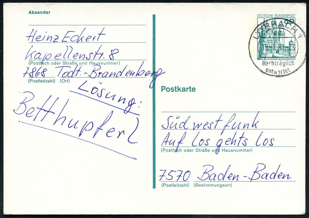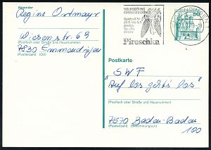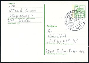 5812 | 8 € | POSTLEITRAUM 7800 (OHNE FREIBURG) : 7868 Todtnau 1986 PU 80 Pf. Burgen, oliv: STANDORT FAHL, 25 JAHRE.. (Eichenlaub, Wappen etc.) ungebr. (Mi.PU 117) | ![]() | |
