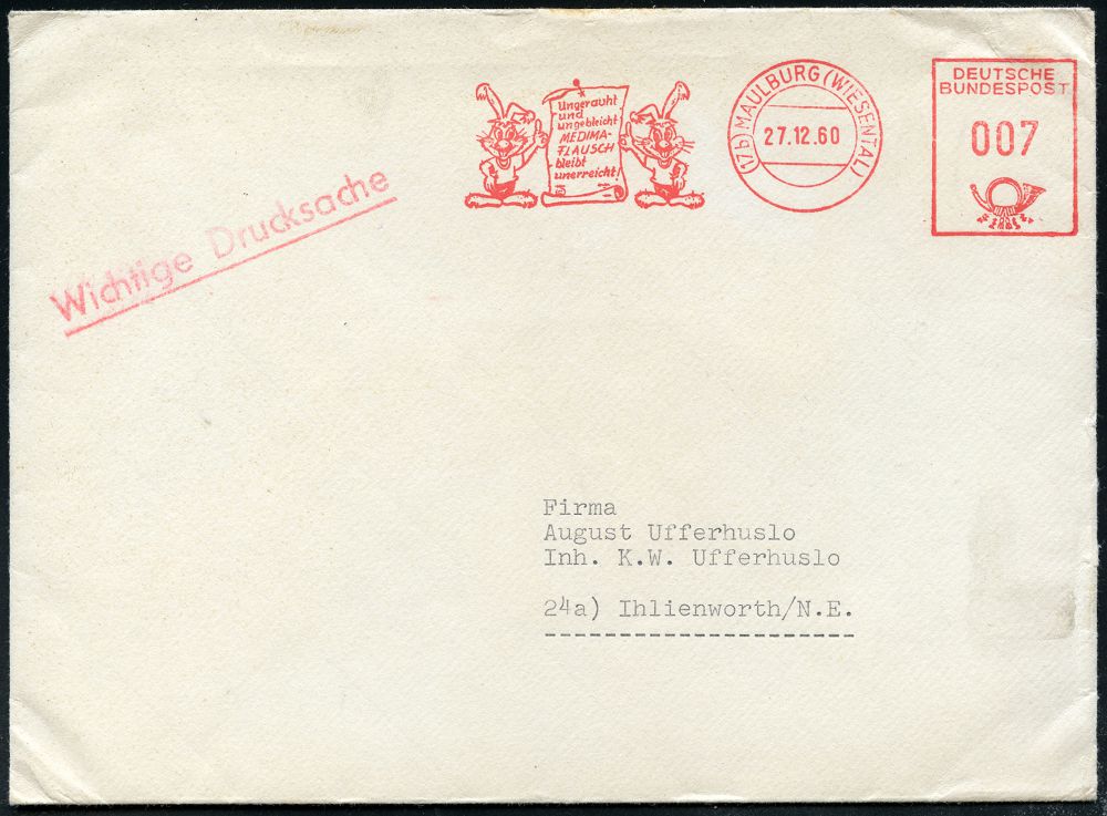 5738 | 15 € | POSTLEITRAUM 7800 (OHNE FREIBURG) : (17b) MAULBURG (WIESENTAL)/ ..MEDIMA-/ FLAUSCH.. 1960 (27.12.) AFS Francotyp (2 Hasen) = Angora-Unterwäsche, Inl.-Drs.-Bf. (Dü.E-26) | ![]() | |