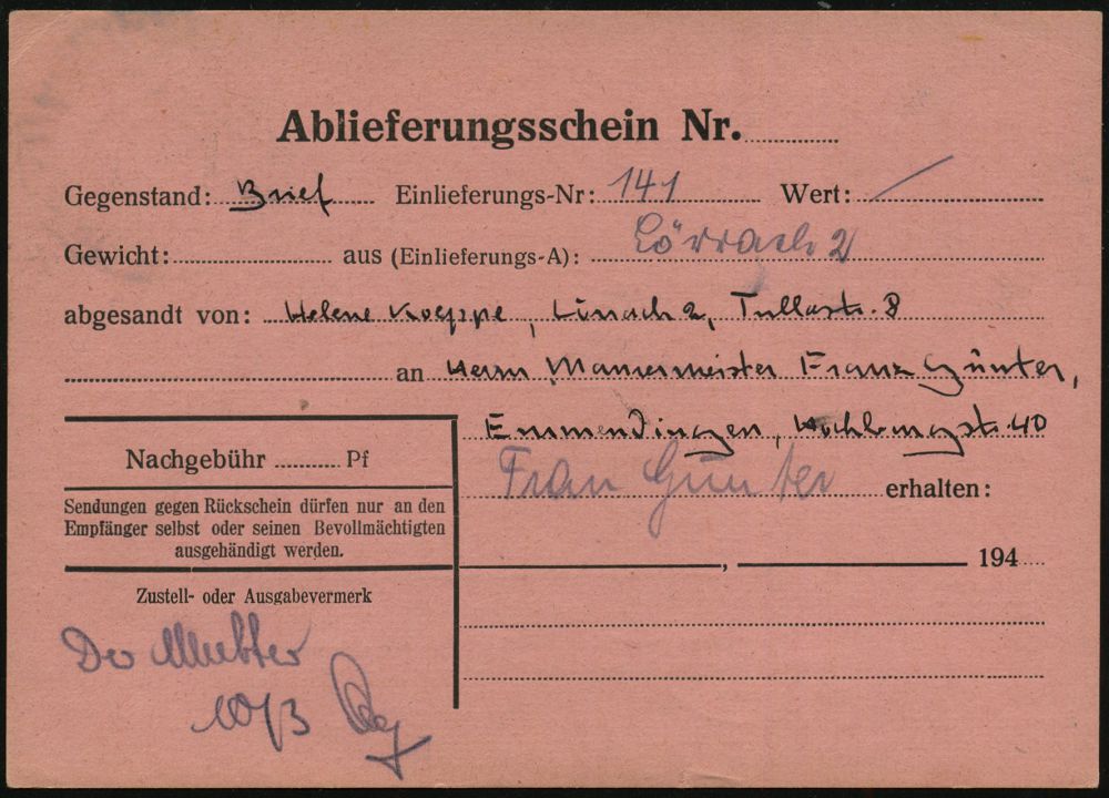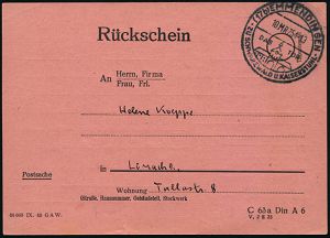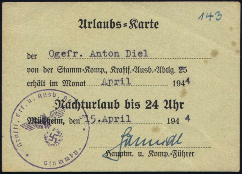 5741 | 18 € | POSTLEITRAUM 7800 (OHNE FREIBURG) : Müllheim 1944 (15.4.) Urlaubskarte für Nachturlaub bis 24 Uhr (Format 10,4 x 7,4 cm) Ortsvordr. (kl.Fleckchen), viol. 1K-HdN: Kraftf. Ers. u. Ausb. Abt. 5/Stammkp. | ![]() | |