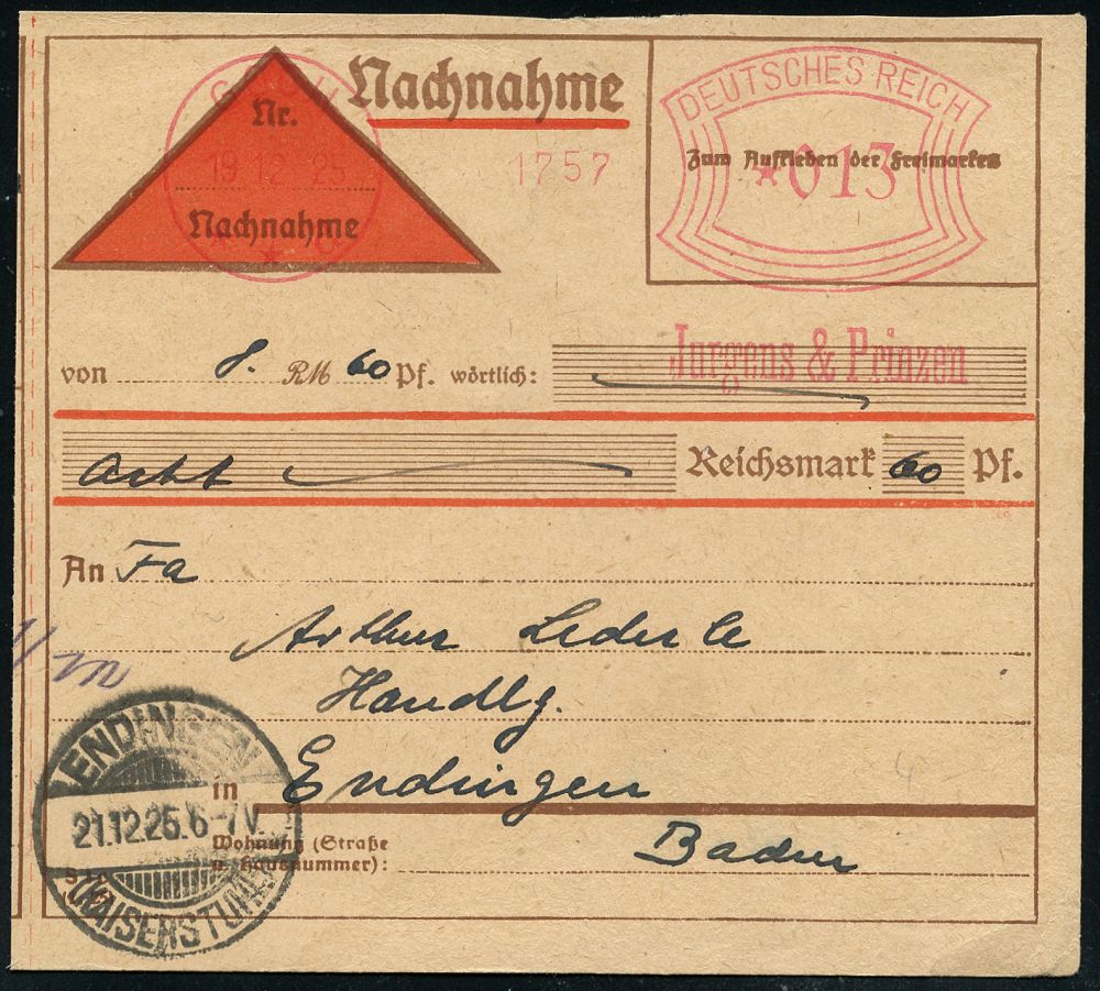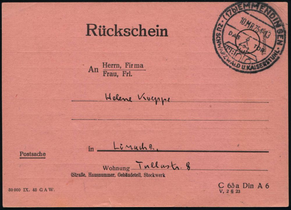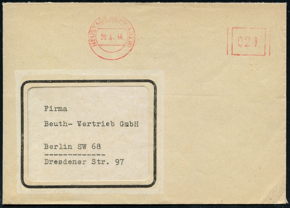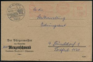 5749 | 22 € | POSTLEITRAUM 7800 (OHNE FREIBURG) : NEUSTADT (SCHWARZW) 1946 (20.5.) total aptierter AFS Francotyp "Reichsadler" ohne Rahmeninschrift u. Werbeklischee = Notmaßnahme! , rs. Abs.-Vordruck: Bezirkssparkasse, (Dü.E-13J-109o = seltene Type!) | ![]() ![]() | |