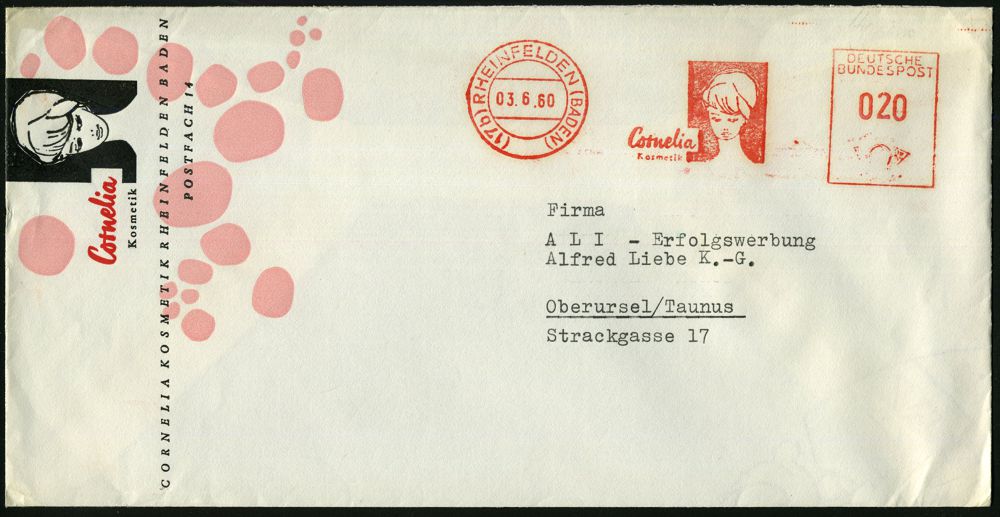 5758 | 15 € | POSTLEITRAUM 7800 (OHNE FREIBURG) : (17b) RHEINFELDEN (BADEN)/ Cornelia/ Kosmetik 1960 (3.6.) AFS Francotyp (Frauenkopf) klar auf motivgl. Reklame-Bf. (E-23CO) | ![]() | |