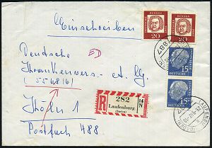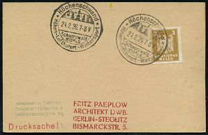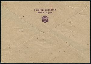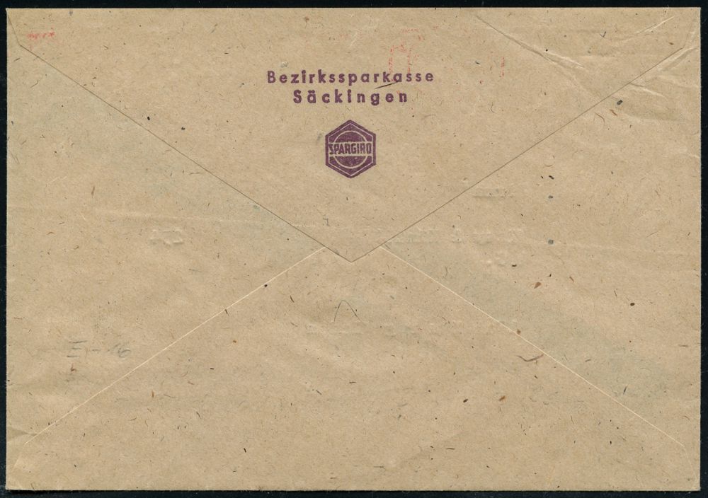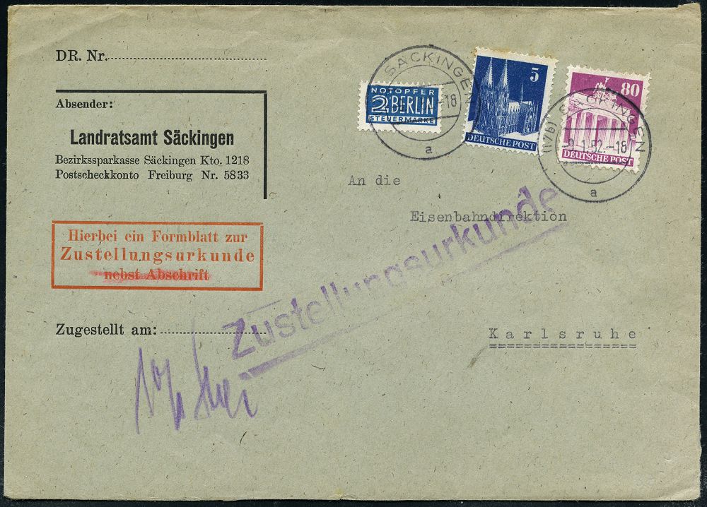 5771 | 16 € | POSTLEITRAUM 7800 (OHNE FREIBURG) : (17b) SÄCKINGEN/ a 1952 (9.1.) 2K-Steg auf Bauten 5 Pf. + 80 Pf. , Dienst-Bf.: Landratsamt = Fern-Zustellurkunde, = seltene Portostufe (Mi.75 eg, 94 wg) | ![]() | |