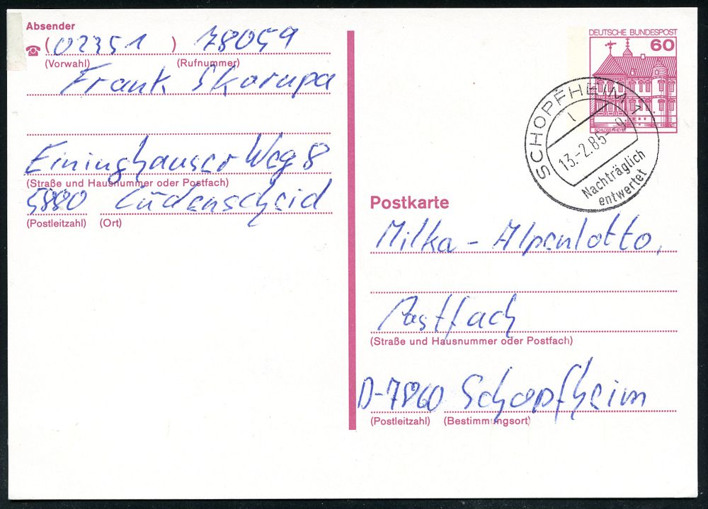 5786 | 6 € | POSTLEITRAUM 7800 (OHNE FREIBURG) : SCHOPFHEIM 1/ l/ Nachträglich/ entwertet 1985 (13.2.) 1K-Segment ohne PLZ auf Bedarfs-Karte n. Schopfheim | ![]() | |
