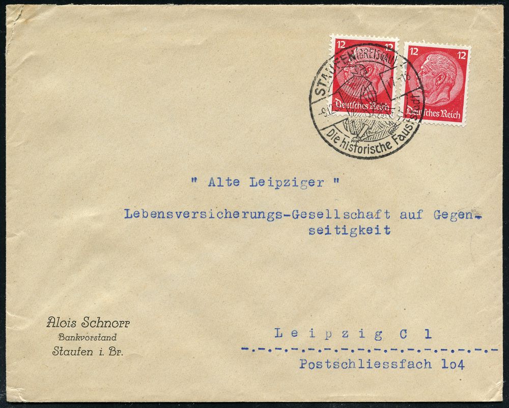 5787 | 20 € | POSTLEITRAUM 7800 (OHNE FREIBURG) : STAUFEN (BREISGAU)/ Die historische Fausstätte 1937 (29.10.) HWSt = Mephisto klar auf Vordruck-Bf.: Alois Schnorr, Bankvorstand.. (rs. Klappenriß geschl.) n. Leipzig (Bo.1) | ![]() | |