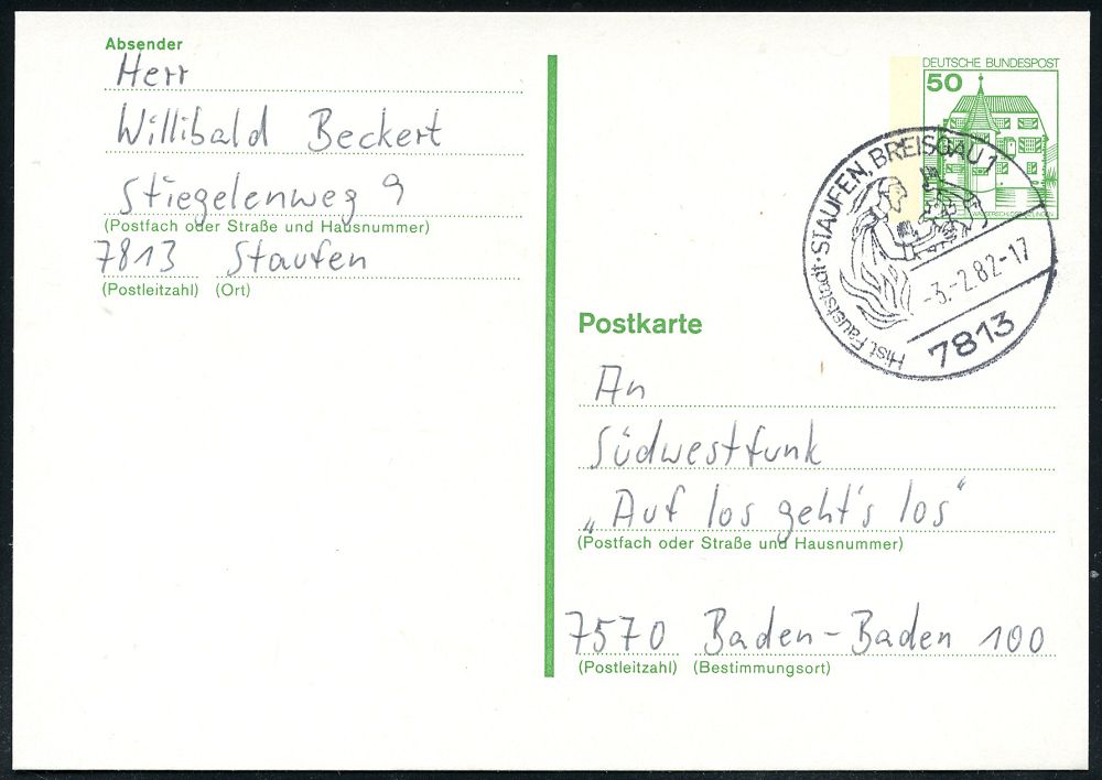 5789 | 6 € | POSTLEITRAUM 7800 (OHNE FREIBURG) : 7813 STAUFEN,BREISGAU 1/ Hist.Fausstadt 1983 (3.2.) HWSt = Faust u. Mephisto (Höllenfeuer) Bedarfs-Kt. | ![]() | |