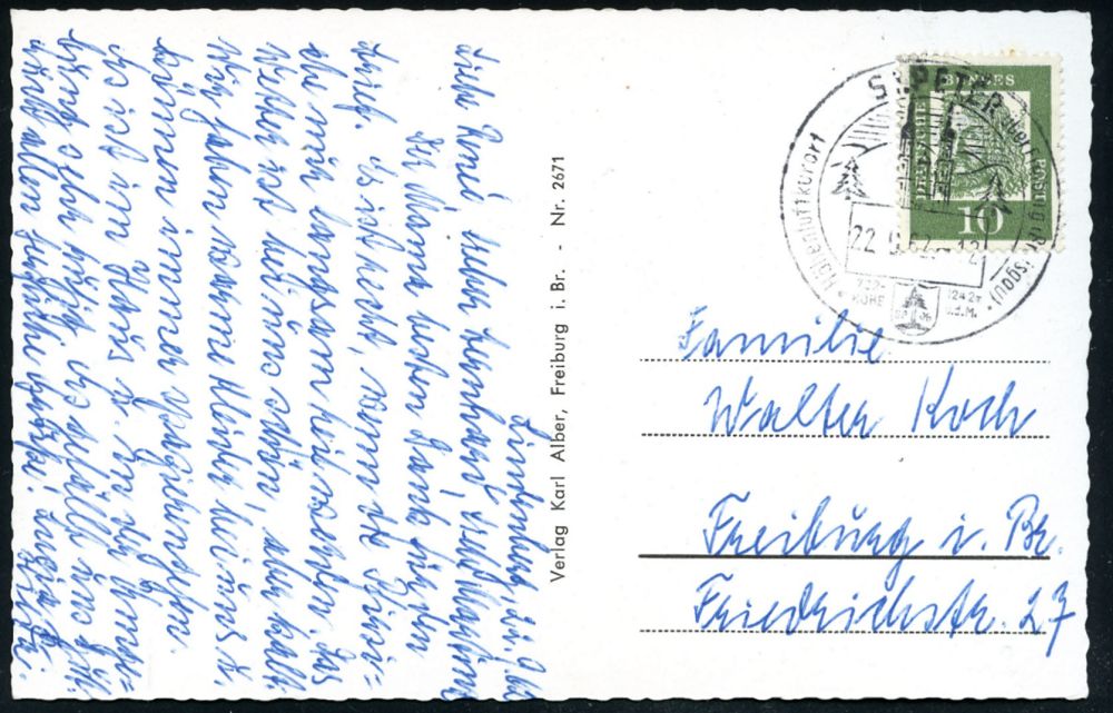 5777 | 12 € | POSTLEITRAUM 7800 (OHNE FREIBURG) : ST.PETER über Freiburg (Breisgau)/ Höhenluftkurort 1962 (22.9.) aptierter HWSt = alte PLGZ entfernt (Kirche/Tannen) s/w.-Foto-Ak.: Lindenberg, Bedarf (Bo.1 aptiert) | ![]() ![]() | |