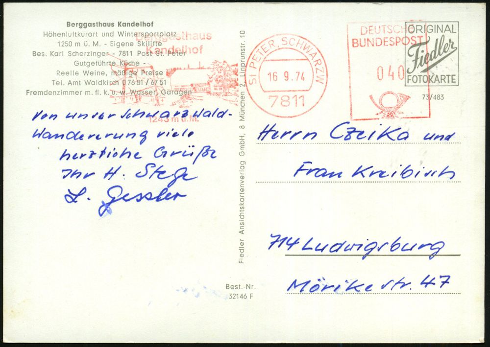 5778 | 15 € | POSTLEITRAUM 7800 (OHNE FREIBURG) : 7811 St PETER,SCHWARZW/ Berggasthaus Kandelhof 1974 (16.9.) AFS Postalia "Posthorn" 040 Pf., zulässige Fremdnutzung eines Freistemplers durch Gast (Gasthof) Bedarfs-s/w.-Foto-Ak: Berggasthaus Kandelhof (7 Ansichten) seltene Verwendung! (Dü.E-26 B) | ![]() ![]() | |