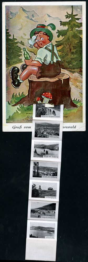 5800 | 16 € | POSTLEITRAUM 7800 (OHNE FREIBURG) : Titisee 1953 (2.9.) Leporello-Künstler-Ak.: Gruss vom Titisee.. (Wanderer auf Baumstumpf, Pilze) aufklappbare 10 Miniatur-Fotos, Bedarf | ![]() ![]() | |
