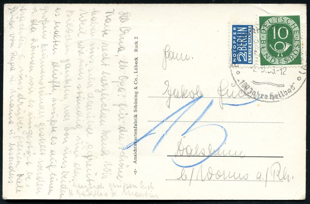 5729 | 14 € | POSTLEITRAUM 7800 (OHNE FREIBURG) : (17b) LÖRRACH/ b/ DEUTSCHE/ BUNDESPOST 1953 (11.8.) PFS "Achteck" mit Posthorn 06 Pf. mit Uhrzeit auf Reklame-Bf.: Probatum est, Pharmazeutische Informationen.. (Papierkorb) n. West-Berlin (Dü.D-16, Nr.272 = Posthorn mit 4 Blitzen) | ![]() | |