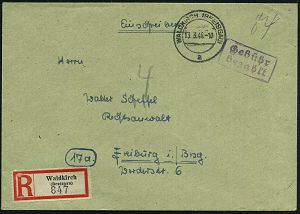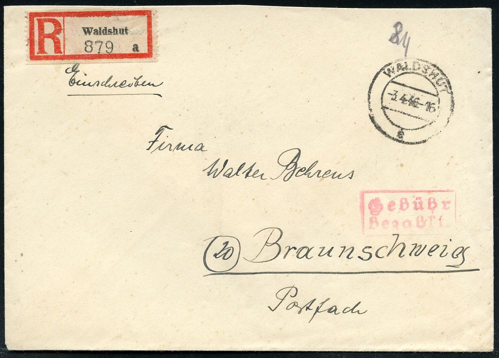 5822 | 15 € | POSTLEITRAUM 7800 (OHNE FREIBURG) : WALDSHUT/ e 1946 (3.4.) 2K-Steg + roter Ra.2: Gebühr/bezahlt + RZ: Waldshut/a , Fern-R-Bf. n. Braunschweig, rs. AS.: BRAUNSCHWEIG 1/t/ A N K U N F T | ![]() ![]() | |