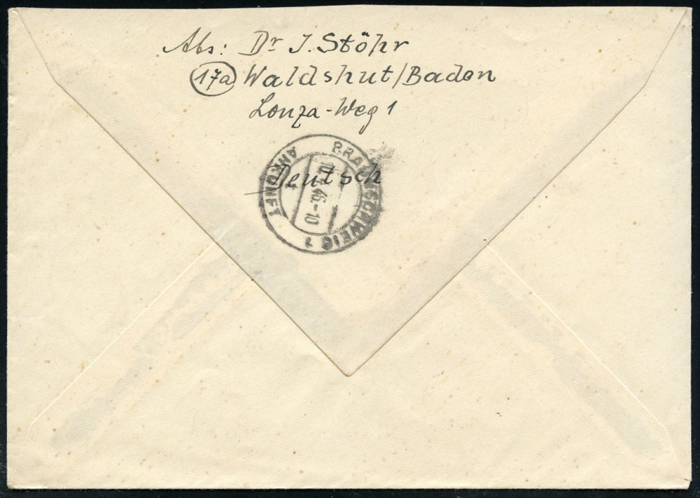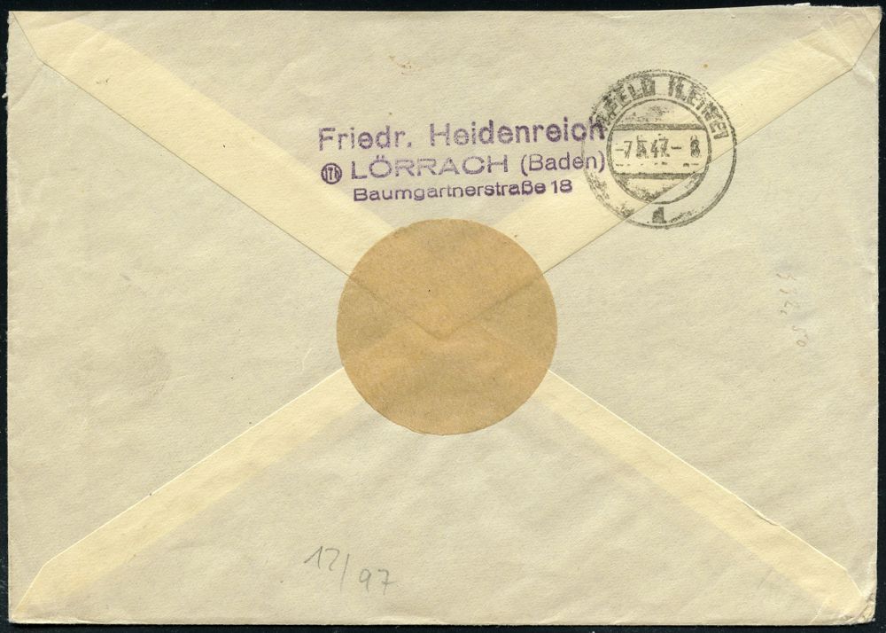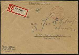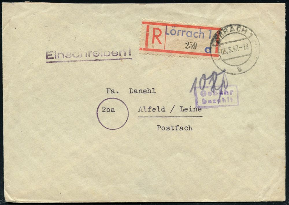 5726 | 15 € | POSTLEITRAUM 7800 (OHNE FREIBURG) : LÖRRACH 1/ s 1947 (3.5.) 2K-Steg + kl. viol. Ra.2: Gebühr/bezahlt + provis. RZ: Lörrach 1/a (viol. 2L auf vierseitig gez. Blanco-RZ) Fern-R-Bf. n. Alfeld, Leine, rs. AS. | ![]() ![]() | |