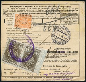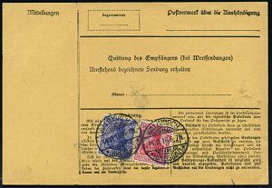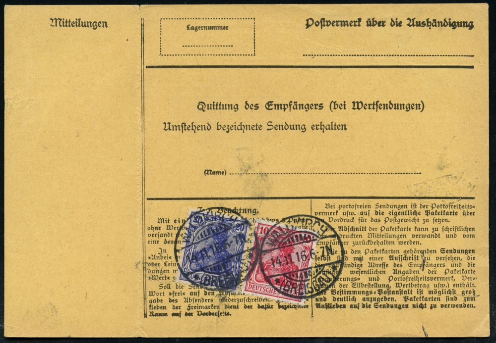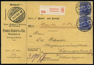 5827 | 25 € | POSTLEITRAUM 7800 (OHNE FREIBURG) : WALDKIRCH/ *(BREISGAU)* 1916 (14.11.) 1K-Gitter auf Paar 20 Pf. Germania (wie MeF + 10 Pf. u. 20 Pf. Germania rs.) + teilgez. ,roter Paketzettel: Waldkirch/(Breisgau), klar gest. Inl.-Wertpaketkt. 450.- Mk. mit Abs.-Talon kompl. (Mi.86 II, 3x 87 II) | ![]() ![]() | |