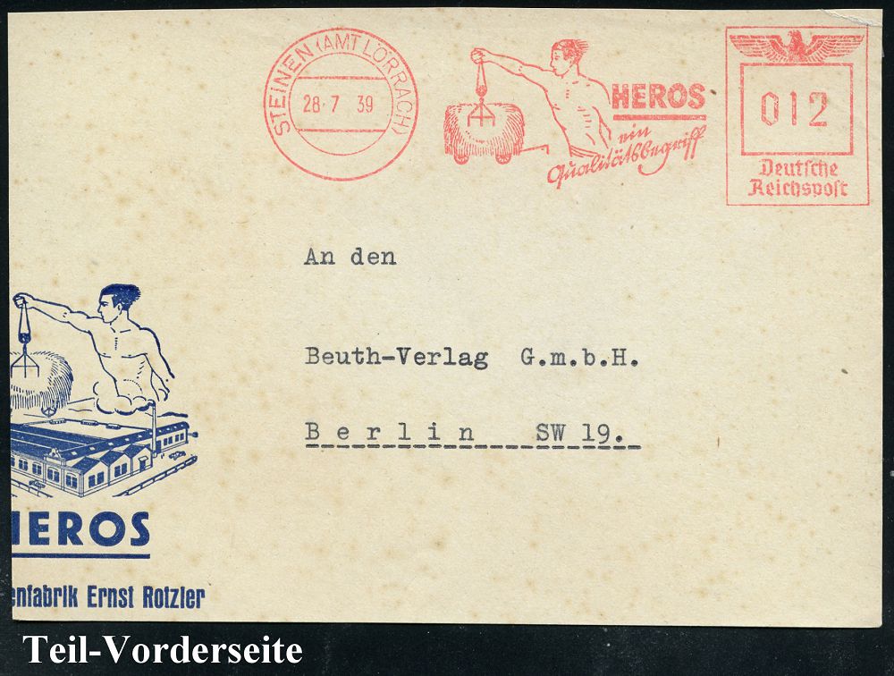 5790 | 14 € | POSTLEITRAUM 7800 (OHNE FREIBURG) : STEINEN (AMT LÖRRACH)/ HEROS/ ein/ Qualitätsbegriff 1939 (28.7.) AFS Francotyp "Reichsadler" (mythischer Athlet hebt Heuwagen) kl. Eckfehler, motivgl. Teil-Vorderseite: Ernst Rotzler (Dü.E-5CGo) | ![]() | |