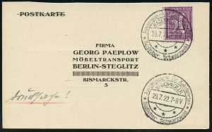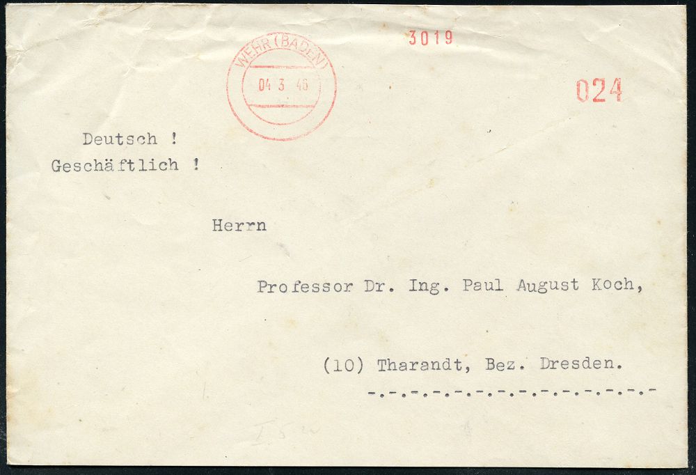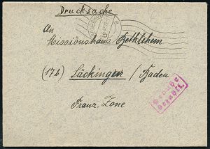 5830 | 25 € | POSTLEITRAUM 7800 (OHNE FREIBURG) : WEHR (BADEN) 1946 (4.3.) total aptierter AFS Francotyp = Wertrahmen u. Werbeklischee entfernt! = Notmaßnahme! , rs. Abs.-Vordruck: Ciba AG, Berlin-Wilmersdorf überstempelt mit : CIBA AG, Wehr = Chemie- u. Pharmafabrik, Fernbf. in die SBZ (Dü.E-16-242h) | ![]() ![]() | |